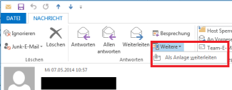 Klicken Sie in der Registerkarte Start auf den Menüpunkt Weitere (neben Weiterleiten). Wenn Sie die zu versendende E-Mail direkt geöffnet haben, klicken Sie oben in der Registerkarte Nachricht auf Weitere. Wählen Sie dort den Untermenüpunkt Als Anlage weiterleiten aus.