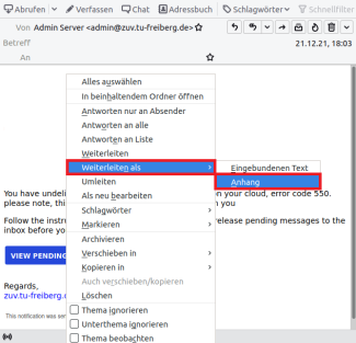 Klicken Sie mit der rechten Maustaste auf die Nachricht. Wählen Sie anschließend im Menü "Weiterleiten als" und dort "Anhang" aus.