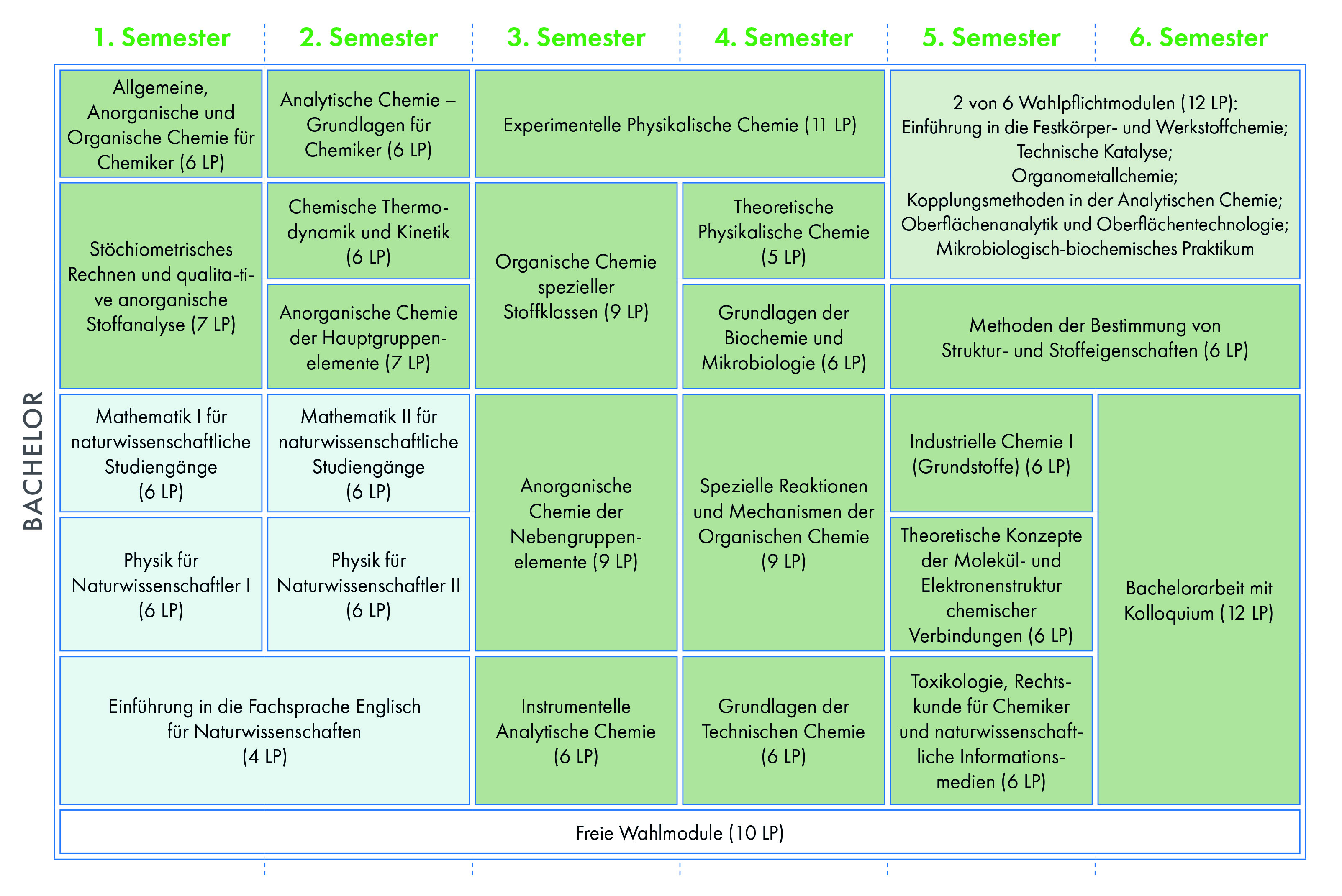 In den ersten vier Semestern lernen Sie die wichtigsten Grundlagen der Anorganischen, Organischen, Physikalischen, Analytischen und Technischen Chemie sowie der Physik und Mathematik und erwerben weitere fachübergreifende Kenntnisse, u. a. in der Fremdsprache Englisch.