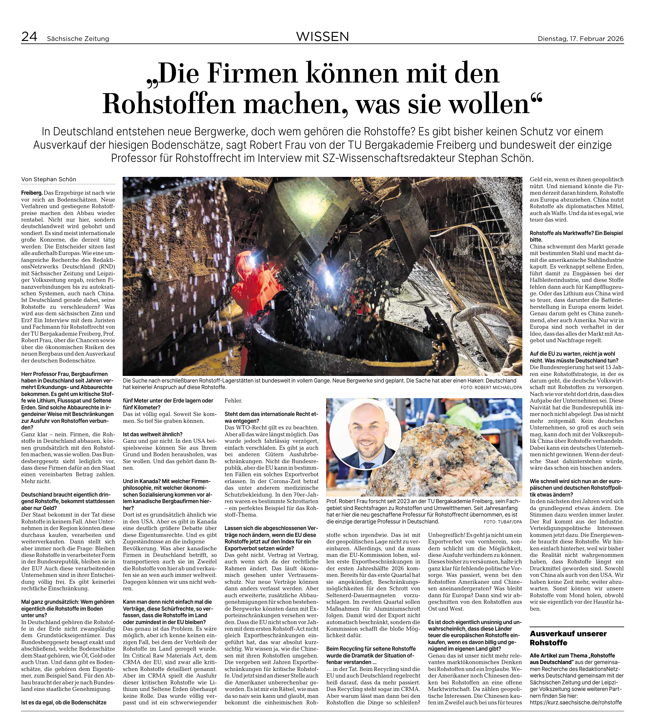 In Deutschland entstehen neue Bergwerke, doch wem gehören die Rohstoffe? Prof. Dr. Robert Frau wurde von der Sächsischen Zeitung zum Thema befragt. Er hat die bundesweit einzige Professur für Rohstoffrecht an der TU Bergakademie Freiberg inne.