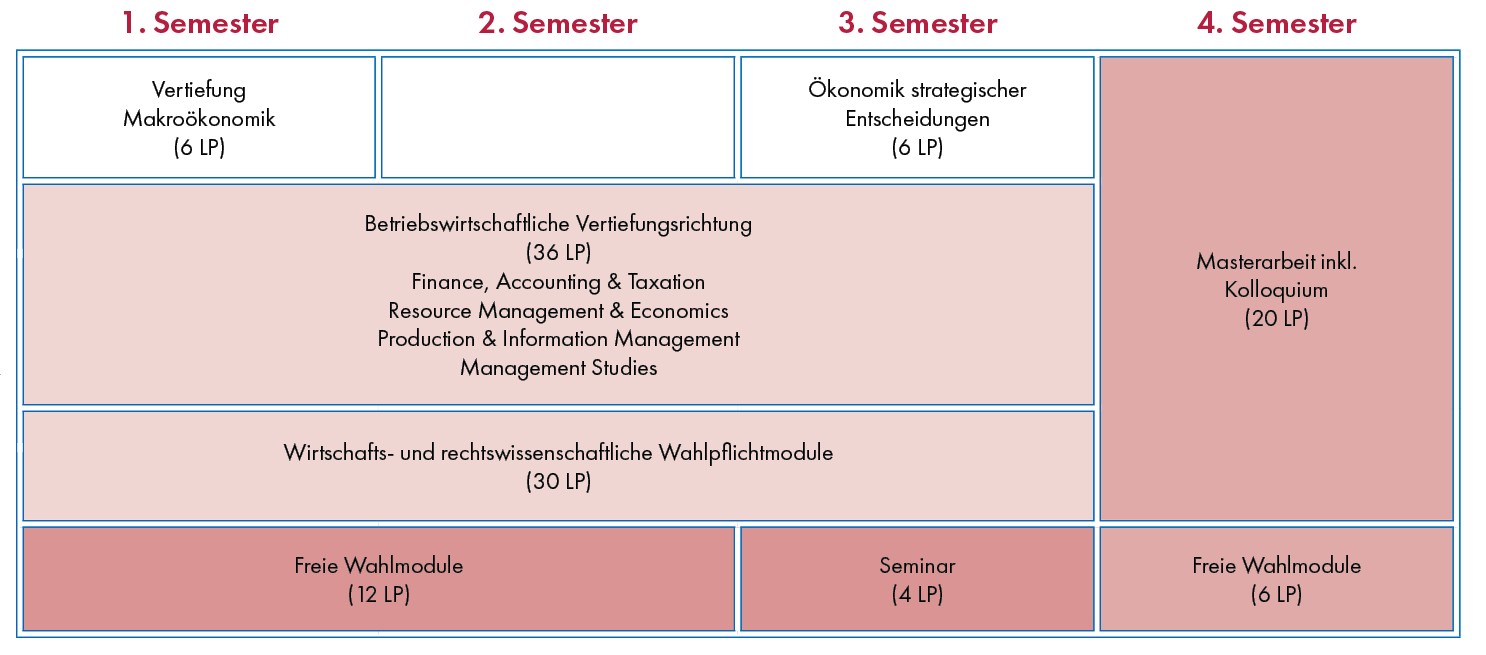 Acquisition of in-depth knowledge in the areas of finance, accounting and taxation. Two modules must be chosen from each of these areas. In the finance area, the modules “Institutionen auf Finanzmärkten”, “Corporate Finance” and “Finanzielles Risikomanagement” are available; in the accounting area the modules “Konzernrechnungslegung”, “Strategisches Controlling” and “ Jahresabschlussanalyse und Politik” and in the taxation area the modules “Steuerliche Gewinnermittlung und Unternehmensbesteuerung“, “Besteuerung der nationalen und internationalen Unternehmensstruktur“ and “Umsatzbesteuerung und Besteuerung der Ressourcenwirtschaft“.