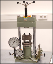 Die Laborpresse besitzt eine kompakte und platzsparende Bauweise und besteht aus hochwertigen Bauteilen, die für eine hohe Belastbarkeit und Langlebigkeit sorgen. Der robuste Pressenrahmen umfasst eine stabile Grundplatte, zwei hartverchromte Pressensäulen sowie ein massives oberes Pressenjoch. In das Pressenjoch ist eine plasmagehärtete Verstellspindel mit Trapezgewinde integriert, die eine schnelle Anpassung der oberen Druckplatte an das Pressmaterial ermöglicht. Dadurch erfolgt der eigentliche Druckaufbau ausschließlich über die doppeltwirkende Handpumpe, die sowohl bei der Abwärts- als auch der Aufwärtsbewegung des Pumphebels hydraulischen Druck erzeugt.