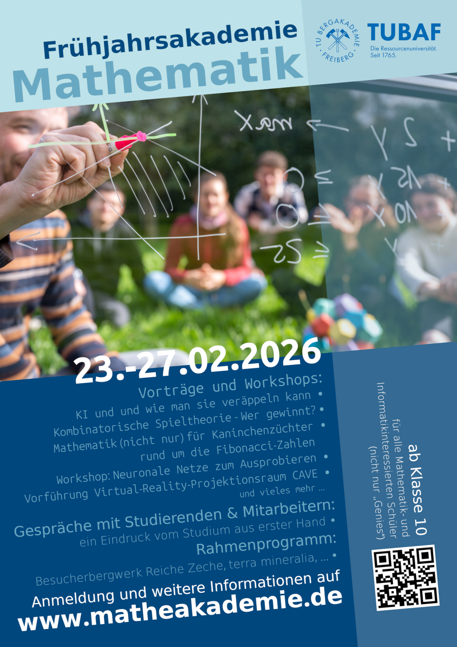 Neben Vorlesungen und Übungen zu spannenden mathematischen Themen, die zeigen, wie interessant und nützlich Mathematik sein kann, bietet diese Art des "Schnupperstudiums" auch die Gelegenheit, sich bei Gesprächen mit Studierenden und Mitarbeitern ein konkretes Bild von den Anforderungen eines Mathematikstudiums sowie vom studentischen Leben in Freiberg zu verschaffen. Daneben bietet das Rahmenprogramm den Teilnehmern die Möglichkeit, sich mit den historischen Sehenswürdigkeiten von Freiberg vertraut zu machen.