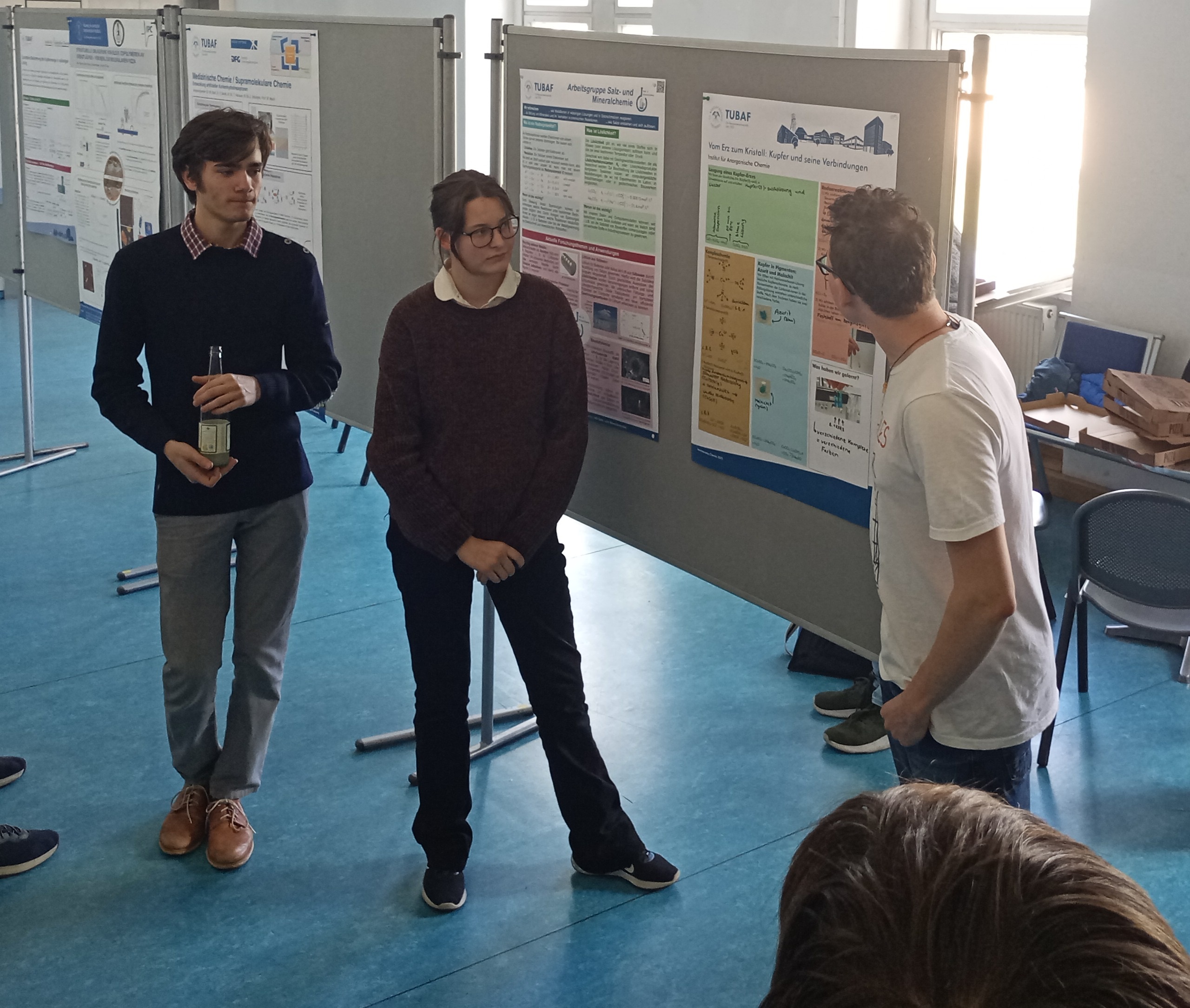 Zum Abschluss gab es am Samstagnachmittag eine Postersession. Die Schülerinnen und Schüler haben zu den in den Instituten durchgeführten Versuchen Poster angefertigt, die sie in der Postersession vorgestellt haben. Es wurden Poster zu Themen wie "Quantitative Bestimmung der Kupfermenge in wässriger Lösung", "Cu-Abscheidung und Oberflächenanalytik mittels AFM" und "Vom Erz zum Kristall: Kupfer und seine Verbindungen" erstellt. Dadurch konnten sich die Teilnehmer auch über die Versuche informieren, bei denen sie nicht selbst dabei waren.