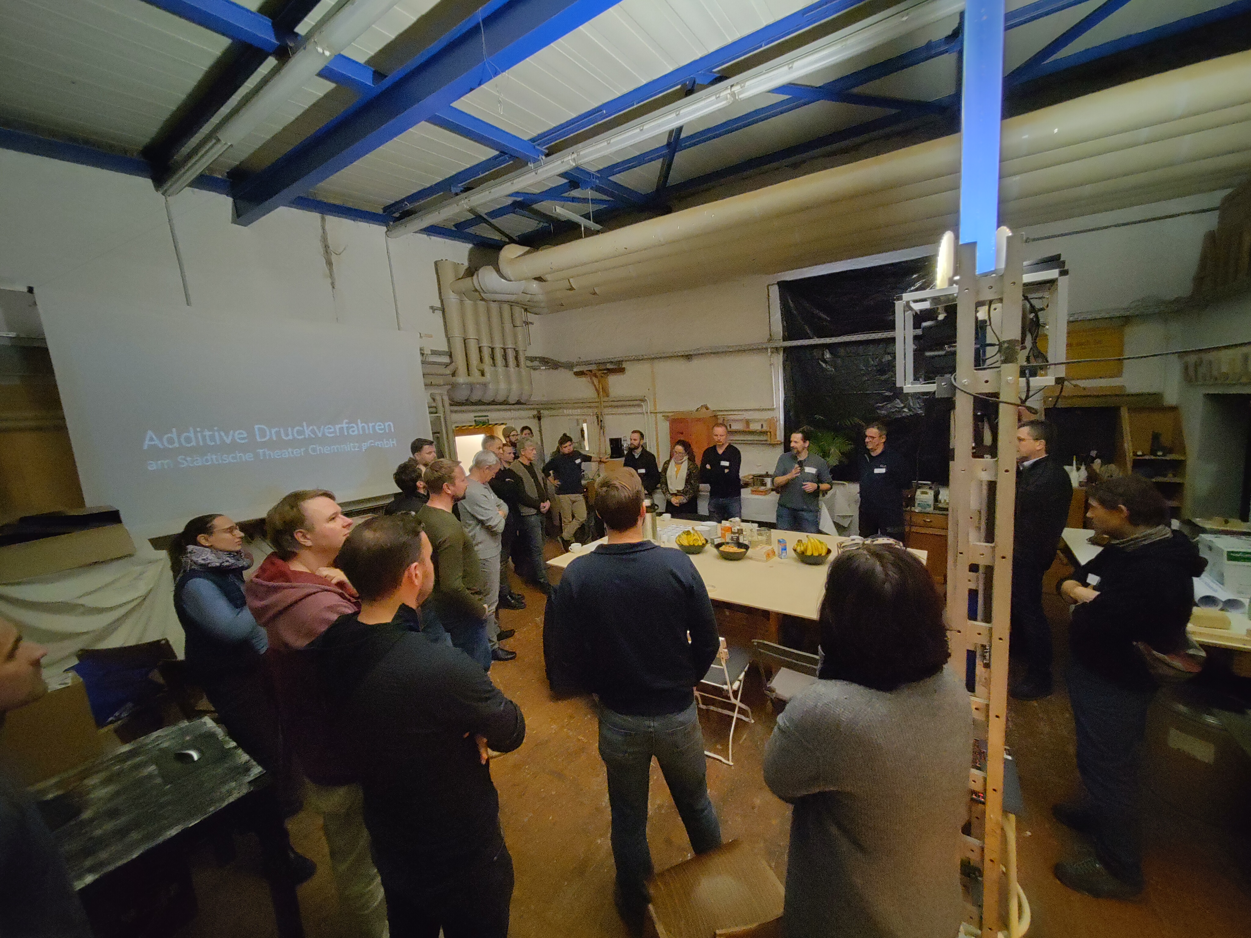 Am 04.12.2025 waren Prof. Dr.-Ing. Henning Zeidler und Dipl.-Ing. Leif Bretschneider zu Gast bei unserem Projektpartner, der Städtische Theater Chemnitz gGmbH, und nahmen an einem Anwenderworkshop in der Theaterwerkstatt teil. Rund 25 Theaterschaffende sowie Wissenschaftler kamen zu einem intensiven fachlichen Austausch zusammen, um über Potenziale und Herausforderungen der Pastenextrusion von Holzspänen für die Herstellung von Theaterkulissen zu diskutieren.