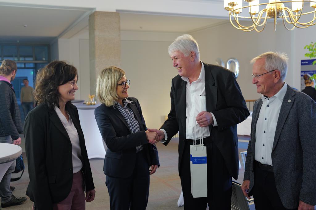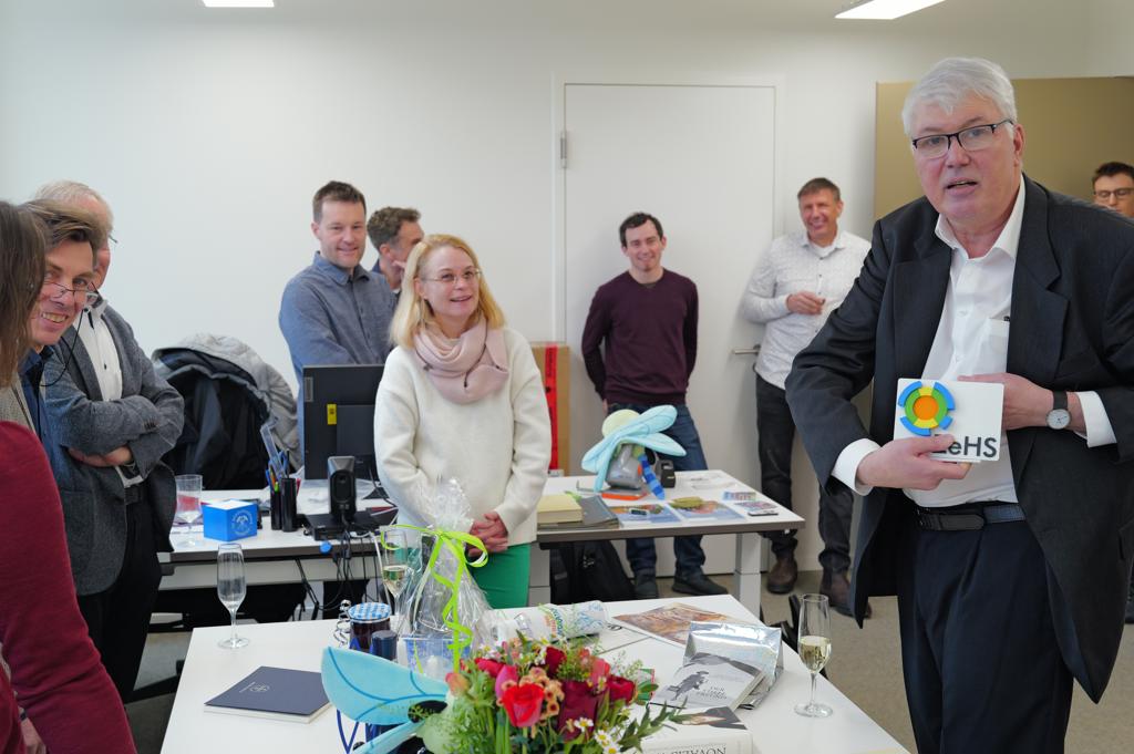 Eine besondere Ehre war eine Ansprache des ehemaligen Rektors Prof. Bernd Meyer, ein, so Dirk Meyer, ganz maßgeblicher Lehrer entlang seines Weges. Eine zusätzliche herausgehobene Würdigung waren ganz sicher die später am Heimatinstitut für Experimentelle Physik persönlich vorgetragenen Worte von Magnifizenz Professorin Jutta Emes. Auch dabei richtete sich der Blick in die Zukunft der Universität. Sowohl die Institutsangehörigen als auch die Vertreterinnen und Vertreter der unter gemeinsamem Dach angesiedelten Physik-Institute drückten sich kreativ aus. So gab es u.a. einen kleinen 3D-Druck des ZeHS, originell ausgewählte Literatur zu Umfeld und Bergbau sowie ein geistiges Getränk, das Bezug auf das Gründungsjahr der Bergakademie im Jahr 1765 nimmt.