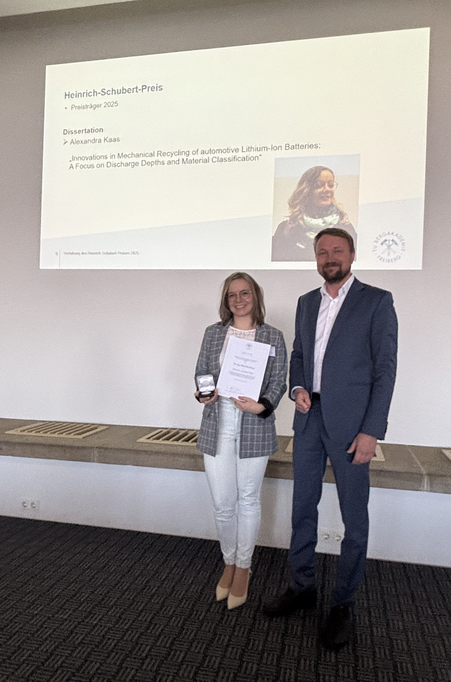 Dr.-Ing. Alexandra Kaas wurde für ihre Dissertation mit dem Titel „Innovations in Mechanical Recycling of automotive Lithium-Ion Batteries: A Focus on Discharge Depths and Material Classification“ (Innovationen im Recycling von Lithium-Ionen-Batterien aus Elektrofahrzeugen: fokussierend auf Entladetiefen und Materialklassierung) ausgezeichnet. In ihrer Dissertation untersuchte Alexandra Kaas das an der TU Bergakademie Freiberg entwickelte Verfahren zum mechanischen Recycling von Lithium-Ionen-Batterien. Sie analysierte, wie unterschiedliche Batterietypen und Entladetiefen das Trennverhalten und die Qualität der Rückgewinnungsprodukte beeinflussen, und bewertete die Prozessrobustheit anhand experimenteller Fallstudien. Besonderes Augenmerk lag auf dem Zick-Zack-Sichter zur Sortierung der Stromsammlerfolien sowie auf der chemischen und physikalischen Analyse der Schwarzmasse. Es konnte u.a. gezeigt werden, dass die Siebung der Separatorfolie anstelle der Windsichtung die Prozessstabilität deutlich erhöht und damit neue Ansätze für ein effizienteres und zuverlässigeres Batterierecycling verspricht.