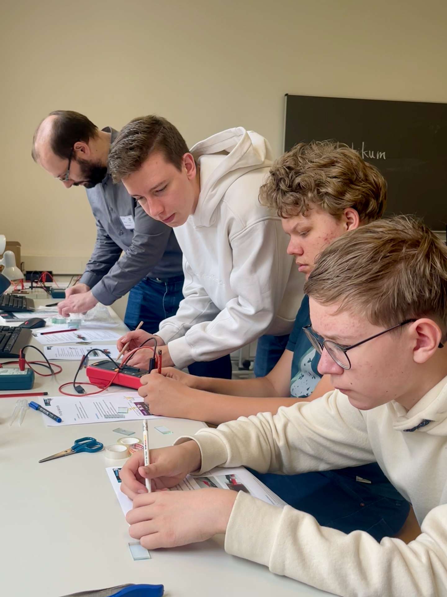 Das Vorlesungsprogramm wurde durch Dr. Michel Oelschlägel vom Institut für Biowissenschaften mit einem Vortrag zur „Nutzung von Mikroorganismen und mikrobiellen Bestandteilen in der Anwendung – Einblicke in unsere Umweltmikrobiologie und Biotechnologie“ eröffnet. Dr. Matthias Müller vom Institut für Angewandte Physik beleuchtete die Fotovoltaik in seinem Vortrag „Solarzellen im Check – Wie viel Energie aus Sonnenlicht schaffen sie wirklich?“. Am Freitag gab Dr. Oelschlägel dann einen weiteren Einblick in seine Forschungsarbeiten zur „Nutzung gentechnischer Methoden für die Entwicklung mehrstufiger biotechnologischer Syntheseverfahren – ein Beispiel aus der Praxis“. Anschließend nahm Professor Jens Kortus vom Institut für Theoretische Physik das von der UN ausgerufene „Internationale Jahr der Quantenwissenschaft 2025“ zum Anlass, mit seinem Vortrag „Auf der Suche nach Schrödingers Katze“, die SchülerInnen in die faszinierende Welt der Quantenmechanik zu entführen.
