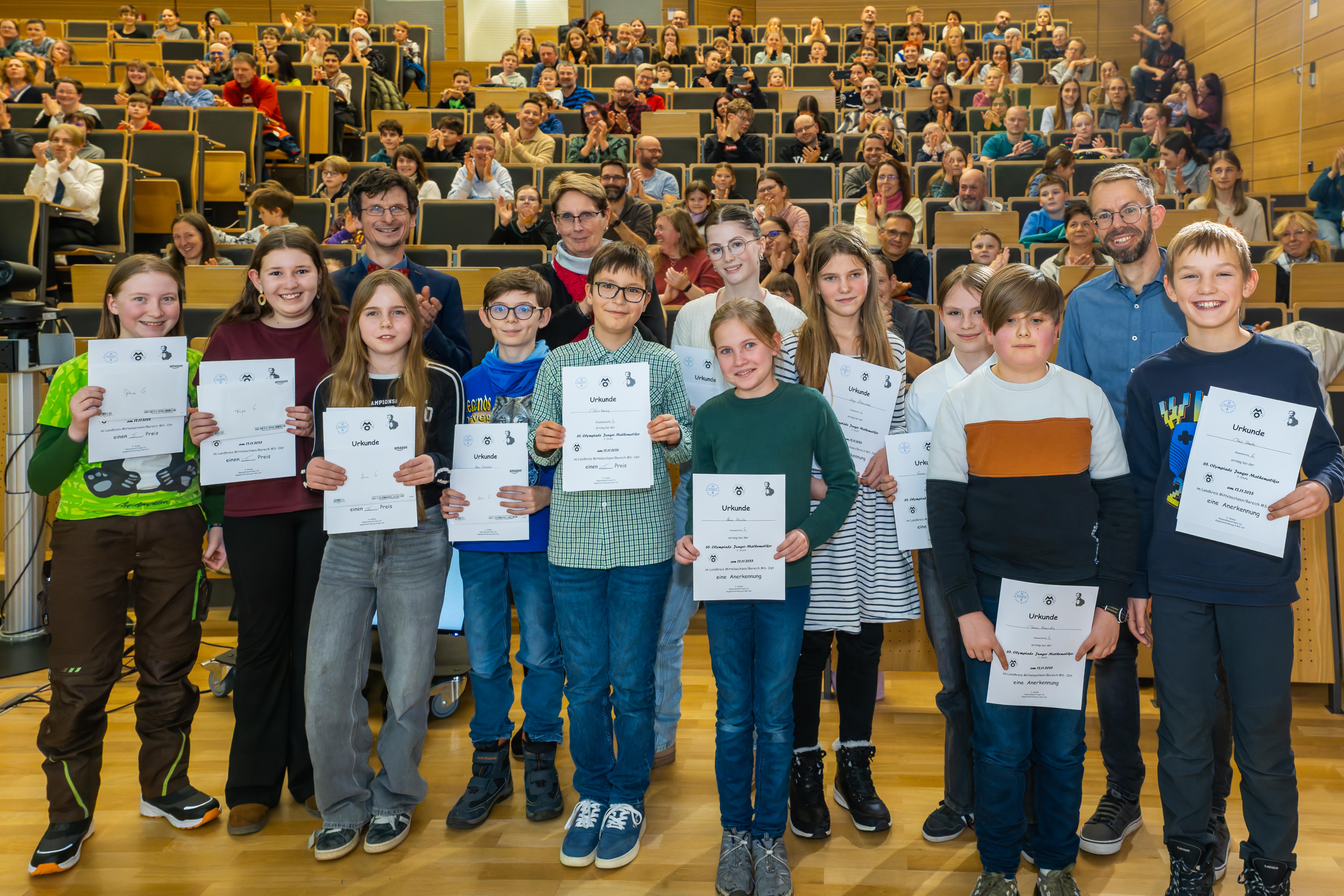 Am 21.11. fand an der TU Bergakademie Freiberg die Siegerehrung der Mathematikolympiade im Schulkreis Mittelsachsen Süd statt. Bereits in der Vorwoche Mittwoch versuchten Schülerinnen und Schüler aus ganz Deutschland, mathematische Probleme zu lösen, welche viel komplizierter als normale Schulaufgaben waren. Die besten Schülerinnen und Schüler wurden während der Festveranstaltung am Freitag ausgezeichnet und vertreten unsere Region im Februar 2026 bei der Landesolympiade. Untermalt wurde die Siegerehrung durch die Freiberger Band "Halblaut".