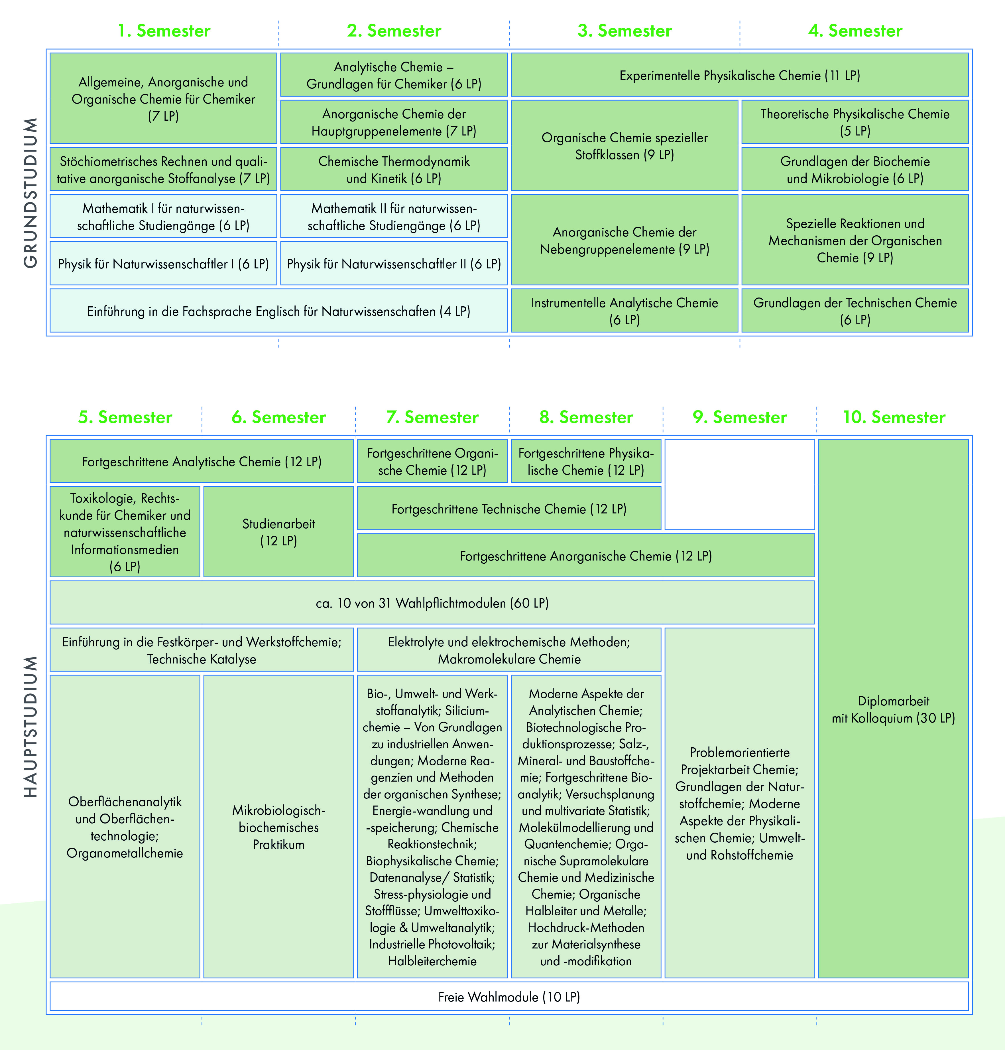 Das klassische Studium der Chemie kann durch einen breiten Wahlpflichtbereich entsprechend Ihrer eigenen Interessenlage ergänzt werden, u.a. durch Module zu aktuellen Themen wie „Energiewandlung und Speicherung“ und „Organische Supramolekulare Chemie und Medizinische Chemie“. Module wie „Umwelt- und Rohstoffchemie“, „Halbleiterchemie“, „Siliciumchemie“ oder „Salz-, Mineral- und Baustoffchemie“ werden an keiner anderen sächsischen Universität angeboten. Wenn Sie dabei Module aus einem bestimmten Themengebiet wählen, können Sie den jeweiligen Studienschwerpunkt (Anorganisch-organische Synthese, Physikalisch-analytische Methoden, Technisch-industrielle Anwendungen oder Umweltchemie und Biotechnologie) auf Ihrem Diplomzeugnis vermerken lassen.