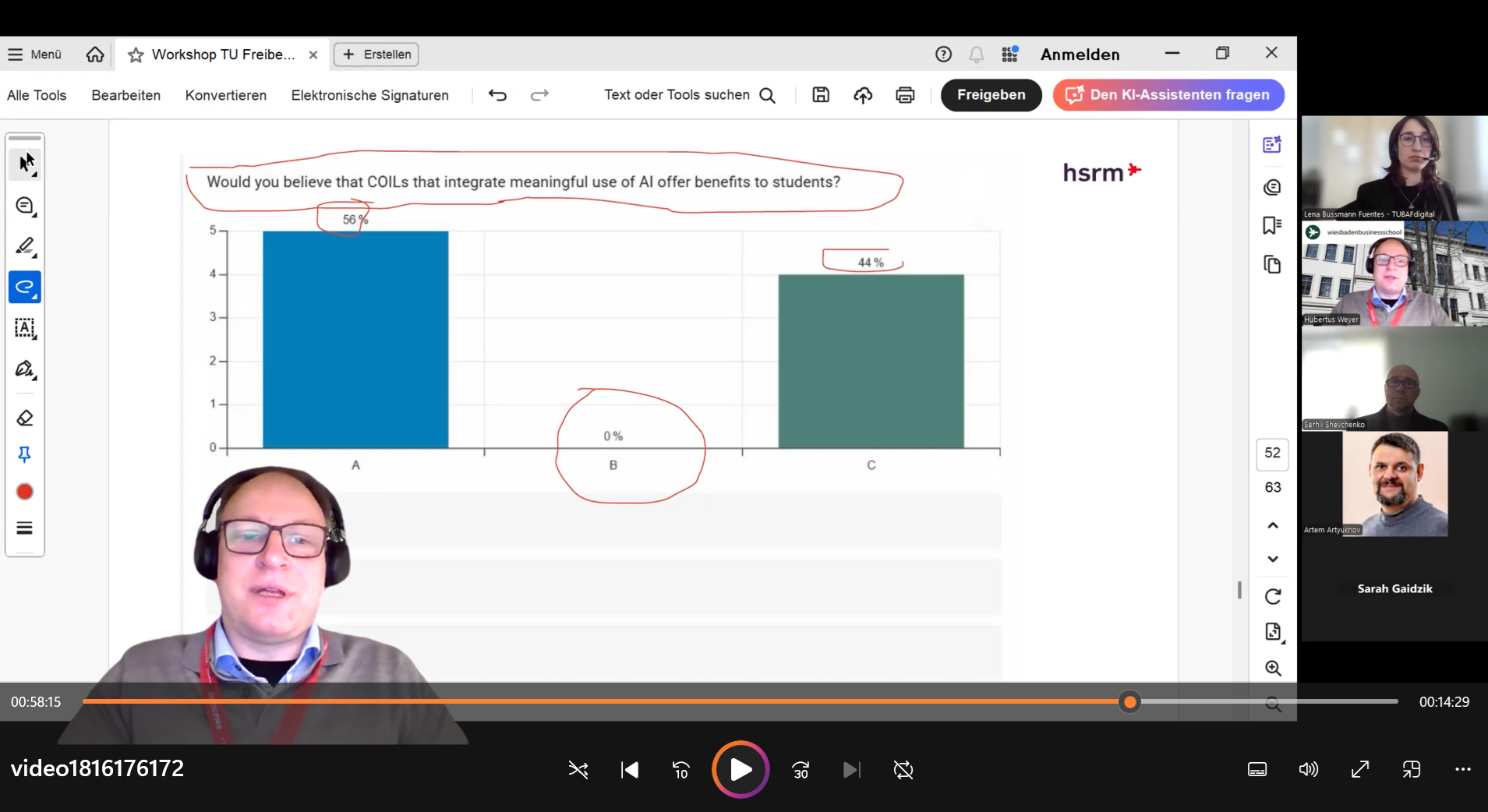 After a brief recap of the past two years of the project, the work packages, and the results, COIL and co-teaching guest expert Hubertus Weyer (Wiesbaden Business School) provided participants with a fundamental introduction to the methodology of collaborative teaching and learning formats. In his presentation, he discussed cutting-edge topics in human-centered collaboration in the age of AI. In doing so, he raised some thought-provoking questions: Why do education systems need to change? How can Collaborative Online International Learning formats support this change? And how can we leverage AI technologies in this process?