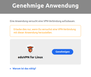 Wird eine Fehlermeldung der Form "MainThread - ERROR - eduvpn.nm - nm.py:1009 - add connection error: g-dbus-error-quark: Message recipient disconnected from message bus without replying (4)" beim Verbinden angezeigt, so hilft es meist die eduVPN-Konfiguration im Network-Manager manuell zu entfernen (bspw. über die Shell) und den eduVPN-Client neu zu starten: