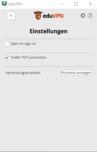 In dem Fall klicken Sie bitte auf rechts oben auf Einstellungen und setzen Sie den Haken bei „Prefer TCP connection“ bzw. „Force TCP“.