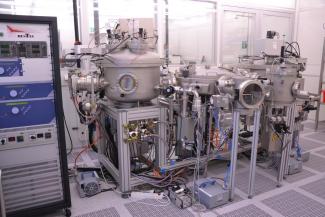 Das Sputtersystem der Fa. Bestec besitzt eine Präparationskammer zur Vorreinigung mittels Plasmaeinwirkung und zwei Prozesskammern. Diese gestatten jeweils RF (Radiofrequenz) und DC (Gleichspannung) und eine Substratheizung bis 600 °C. Sputterkammer 1 nutzen wir für die Abscheidung aus metallischen Targets (2 Quellen á 8 Zoll), bevorzugt Aluminium und Titan. Sputterkammer 2 verfügt über drei Quellen (jeweils 3 Zoll) in konfokaler Anordnung. Dies gestattet das zeitgleiche Sputtern aus mehreren Quellen oder die Abscheidung von verschiedenen dünnen Schichten in wechselnder Abfolge. Die Schichtdicken können mit Schwingquarzen in situ überwacht werden.